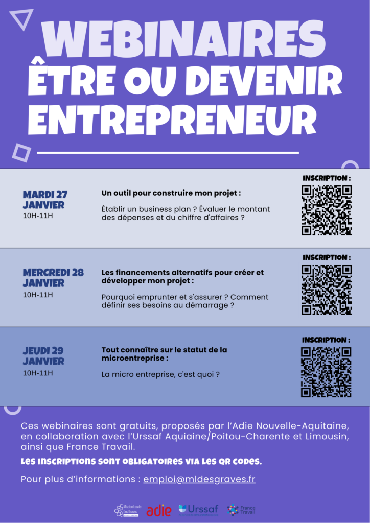 La Mission Locale des Graves, en partenariat avec l’Adie Nouvelle-Aquitaine, l’Urssaf et France Travail, vous propose trois webinaires gratuits et pratiques, pour faire avancer vos projets.