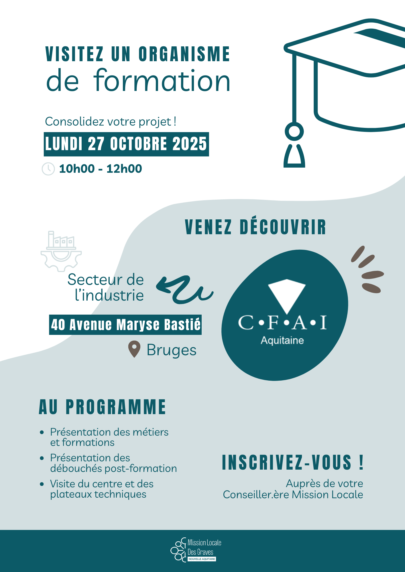 Le 27 octobre 2025 de 10h à 12h Visitez le centre de formation Abskill, spécialisé dans le secteur de la logistique. Au programme : Venez avec votre CV imprimé et à jour. Lieu : 501 Boulevard Alfred Daney, Bordeaux Intéressé.e ? Parlez en à votre conseiller.e