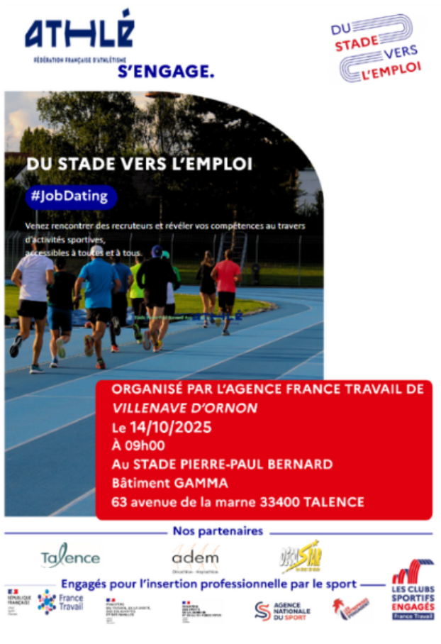 le 14 octobre 2025 de 9h à 12h : Participez au Job Dating “Du Stade vers l’Emploi” : Rencontrez des recruteurs et révélez vos compétences au travers d’activités sportives. Venez avec votre CV imprimé et à jour. Lieu : Stade Pierre-Paul Bernard, Bâtiment GAMMA, 63 avenue de la Marne, Talence