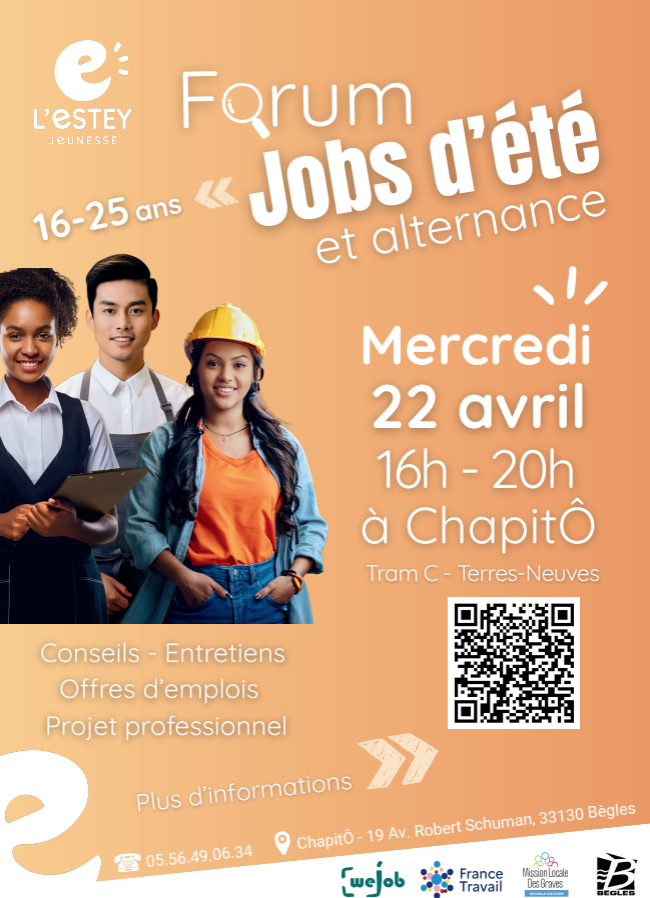 Tu as entre 16 et 25 ans et tu cherches un job d’été, une alternance ou des conseils pour ton projet professionnel ? Ne manque pas le Forum Jobs d’été et alternance organisé par L’Estey Jeunesse ! 📅 Mercredi 22 avril🕓 De 16h à 20h📍 Chapito – Tram C, arrêt Terres-Neuves (Bègles) Au programme : Offres de jobs d’été et d’alternance Entretiens avec des […]