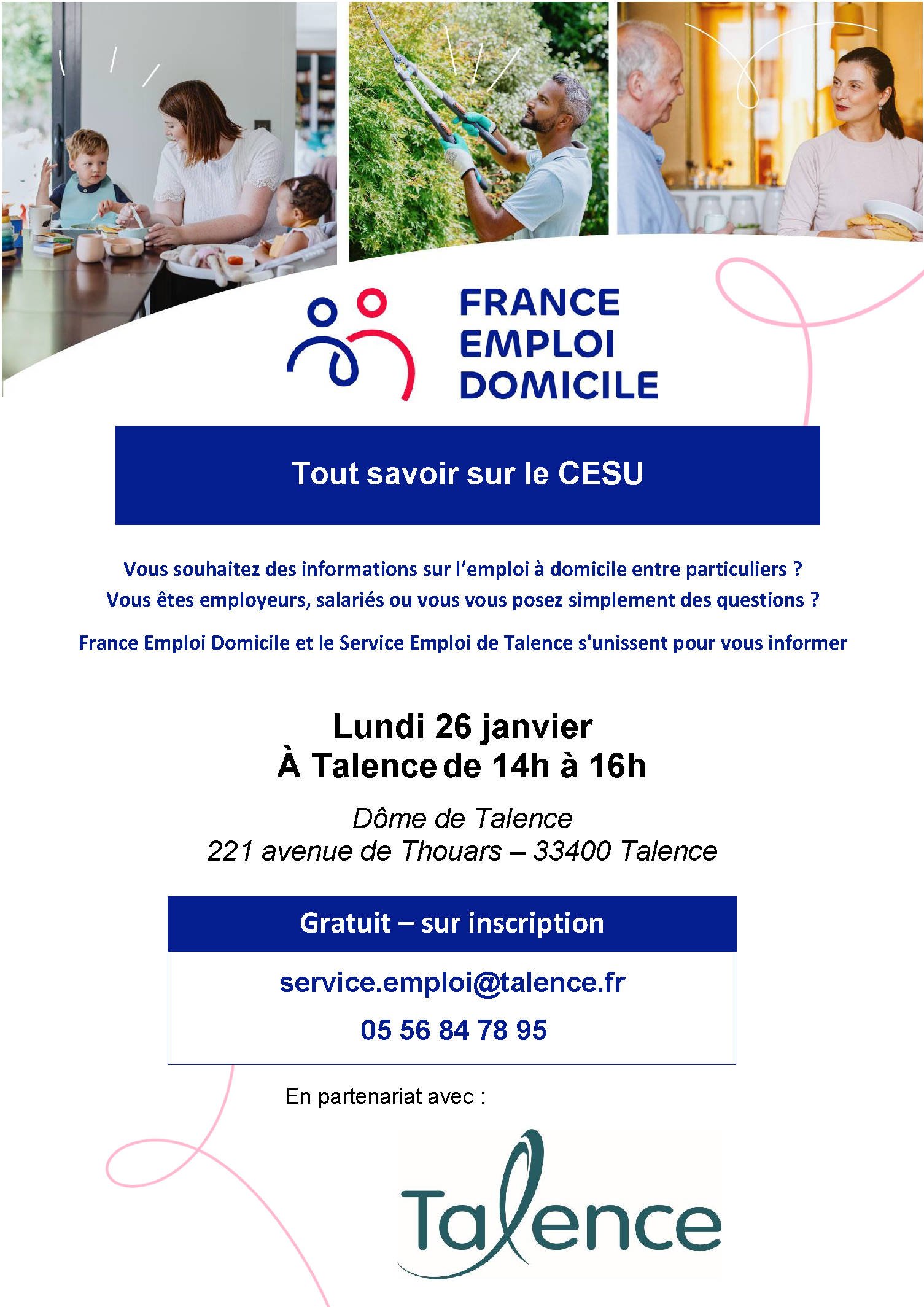 Vous êtes salarié ou employeur dans le secteur de l’emploi à domicile entre particuliers ? Vous avez des questions sur le fonctionnement du CESU (Chèque Emploi Service Universel) ? Ne manquez pas l’événement d’information organisé à Talence. 📅 Rendez-vous le lundi 26 janvier à Talence Horaires : 14h à 16hLieu : Dôme de Talence, 221 […]