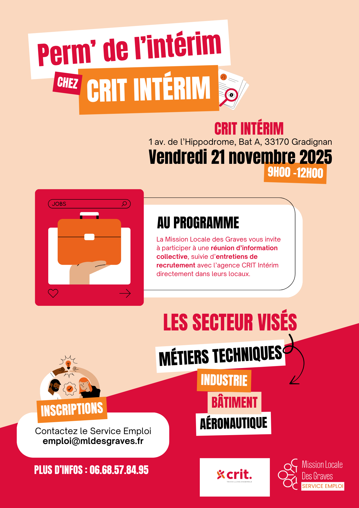 La Mission Locale des Graves organise une matinée dédiée à l’emploi intérimaire le vendredi 5 décembre 2025 (suite au report, initialement prévu le vendredi 21 novembre), de 9h à 12h, dans les locaux de CRIT Intérim, au 1 avenue de l’Hippodrome, Bât A, à Gradignan. Au programme : une réunion d’information collective pour découvrir les […]