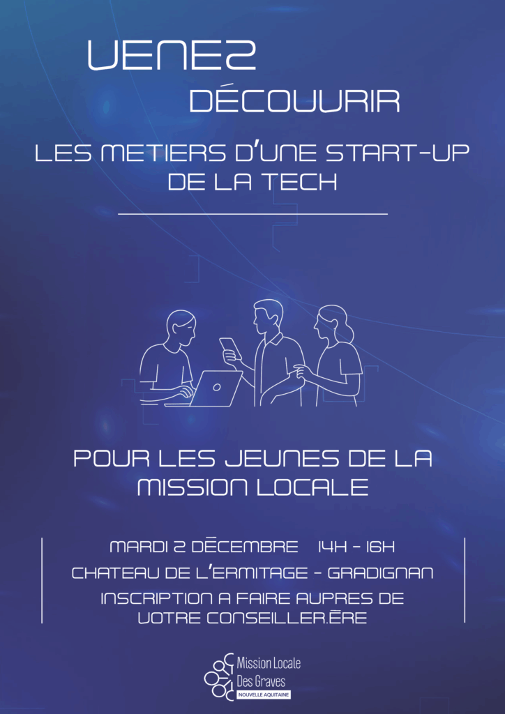 Vous avez entre 16 et 25 ans et vous vous intéressez aux métiers du numérique, de l’innovation et des nouvelles technologies ? La Mission Locale des Graves vous propose un événement inédit pour plonger dans l’univers d’une start-up de la tech.