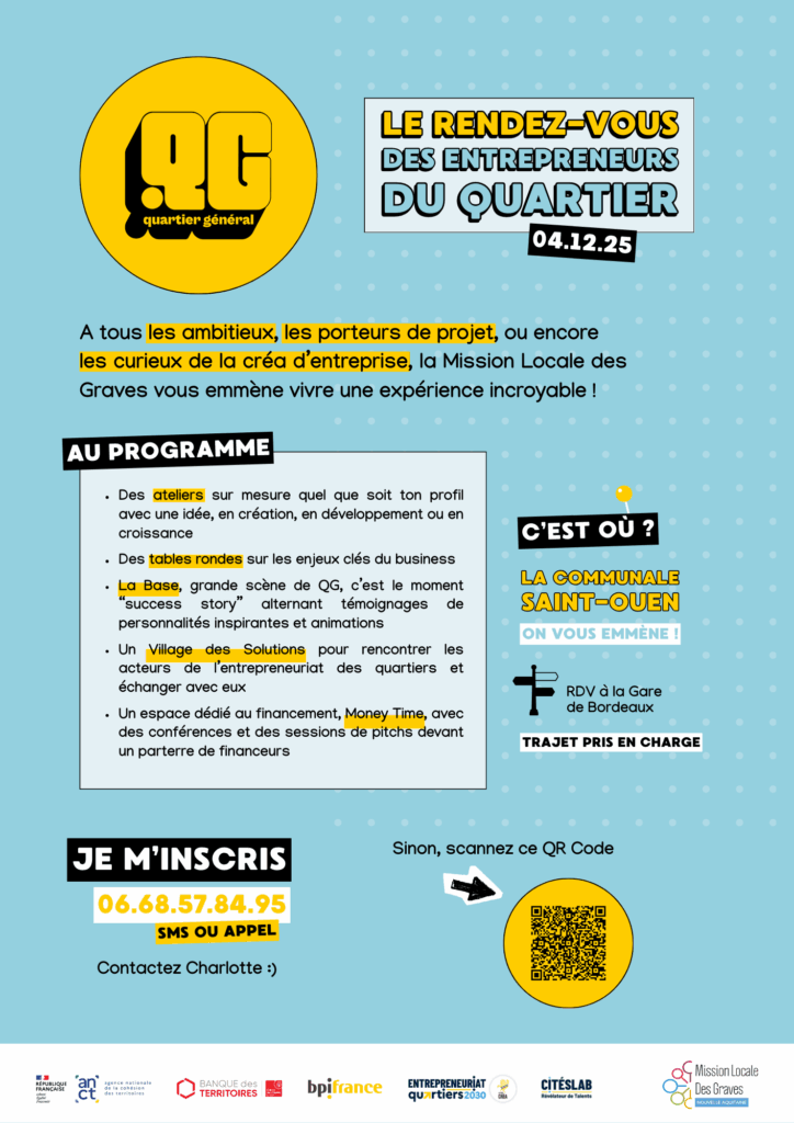 📣 Vous avez un projet, une idée ou simplement l’envie d’entreprendre ? Ne manquez pas « Quartier Général », le grand rendez-vous dédié aux jeunes entrepreneurs issus des quartiers !🗓️ Date : Jeudi 4 décembre 2025